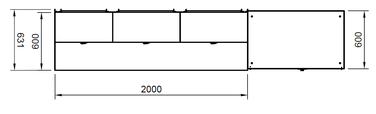 1 x Arbeitsplatte: Maße mm (B x T x H): 2000 x 600 x 25